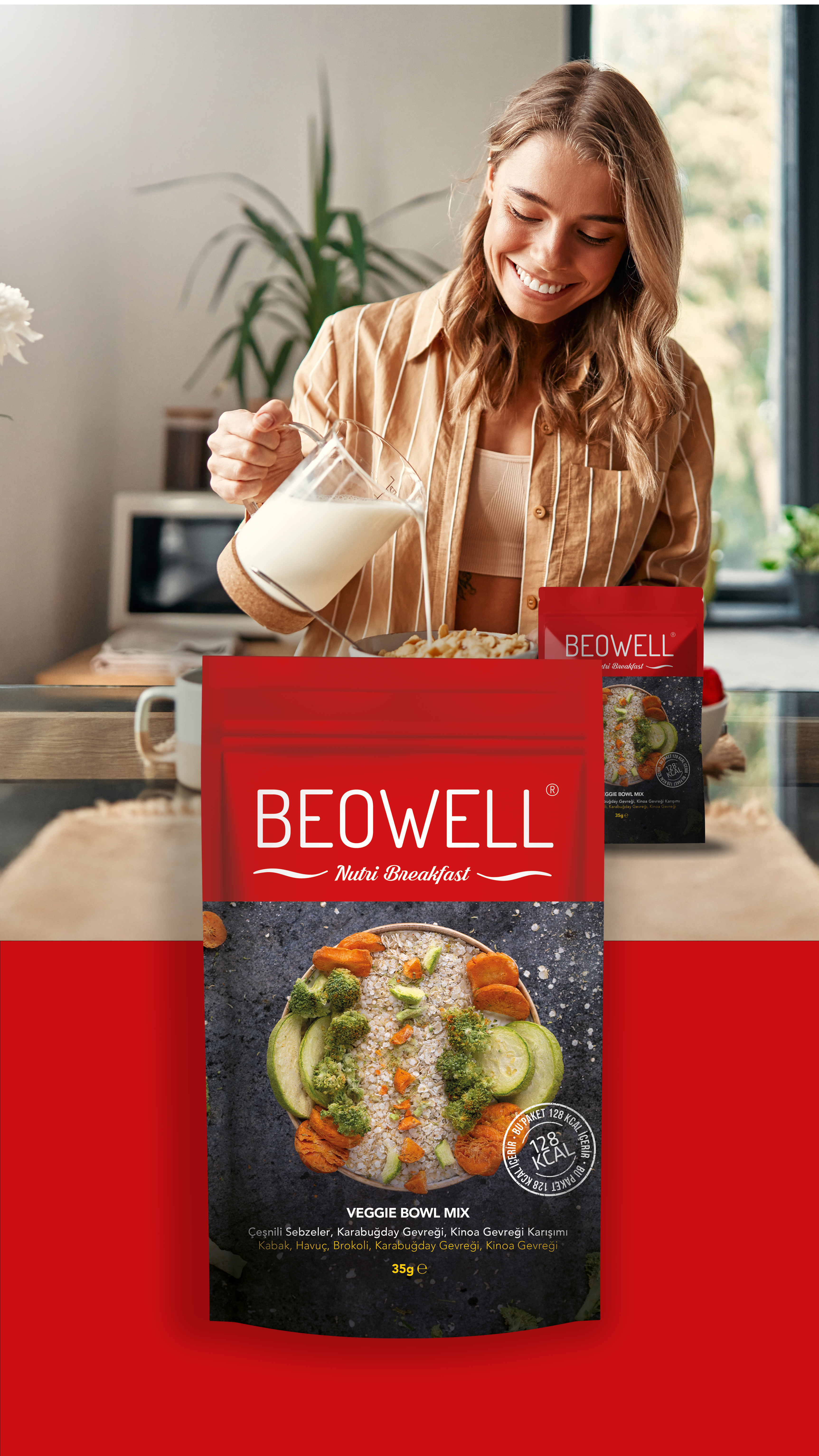 Beowell Nutri Breakfast serisi, 3 meyveli ve 1 sebzeli olmak üzere toplam 4 çeşit üründen oluşur. Her pakette 1 porsiyona eşdeğer içerik bulunur. Glutensiz ve besin değeri yüksek karabuğday ve kinoa gevrekleri, dondurularak kurutulmuş doğal meyve ve sebzelerle buluşarak hem sağlıklı hem de doyurucu bir lezzet sunar.