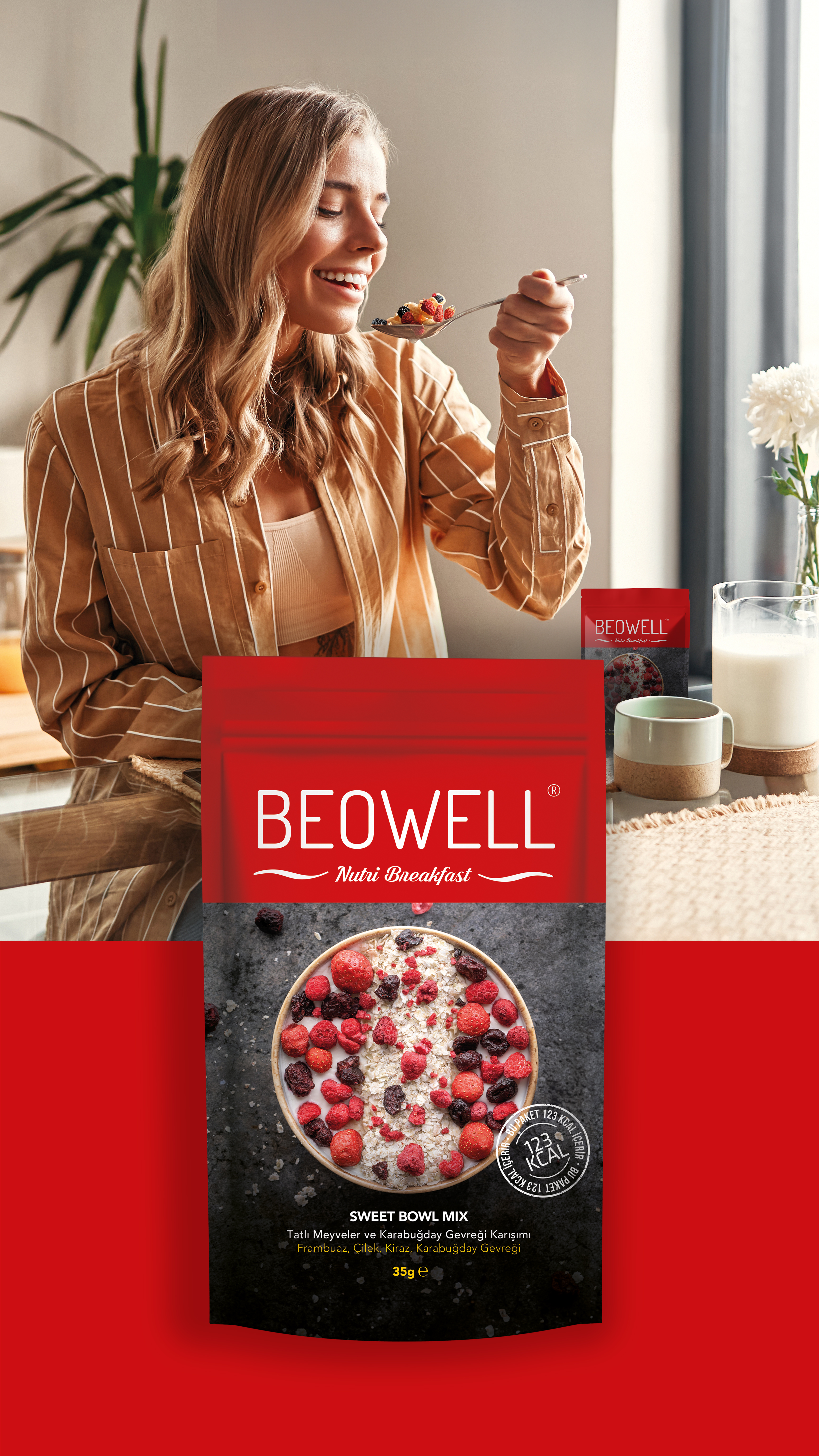 Beowell Nutri Breakfast serisi, 3 meyveli ve 1 sebzeli olmak üzere toplam 4 çeşit üründen oluşur. Her pakette 1 porsiyona eşdeğer içerik bulunur. Glutensiz ve besin değeri yüksek karabuğday ve kinoa gevrekleri, dondurularak kurutulmuş doğal meyve ve sebzelerle buluşarak hem sağlıklı hem de doyurucu bir lezzet sunar.