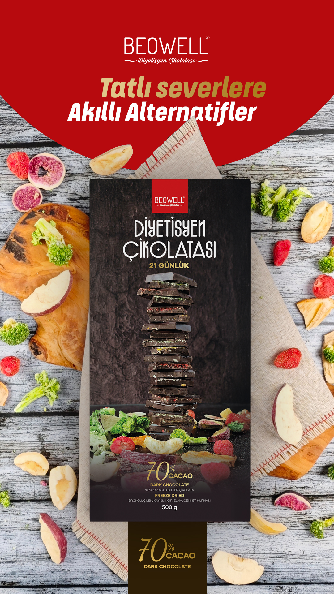 Beowell Nutri Chocolate serisi, bitter çikolata ve dondurularak kurutulmuş sebze/meyveleri birleştirerek çikolata deneyimine sağlıklı bir boyut katıyor. %70 kakaolu bitter çikolata ile zenginleştirilen brokoli, çilek, incir gibi içerikler, ürünlerin vitamin ve mineral değerini artırarak gönül rahatlığıyla tüketilebilecek besleyici bir alternatif sunar.
